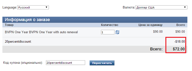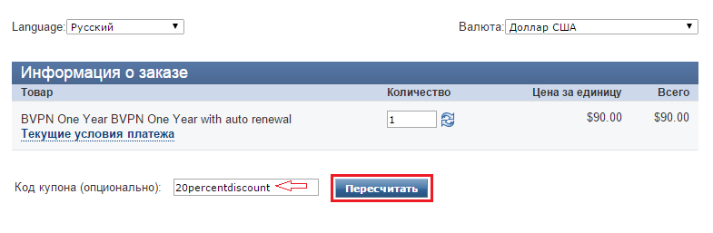 Введите код скидки b.VPN в нужное поле и нажмите “Пересчитать”.